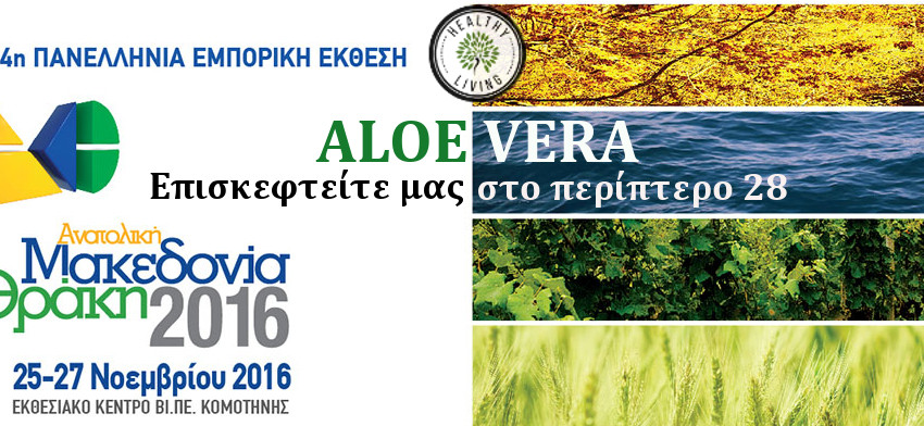 Συμμετέχουμε στην 24η Πανελλήνια Εμπορική Έκθεση Ανατολική Μακεδονία Θράκη 2016 και σας προσκαλούμε όλους να μας επισκεφτείτε στο περίπτερο 28 του Επιμελητηρίου Ξάνθης. Η έκθεση πραγματοποιείται στο Εκθεσιακό Κέντρο στη ΒΙ. ΠΕ. Κομοτηνής και διαρκεί από τις 25-27 Νοεμβρίου 2016. Η είσοδος στην έκθεση είναι ελεύθερη. Ενημερωθείτε για την εταιρία και την Αλόη μας και δοκιμάστε